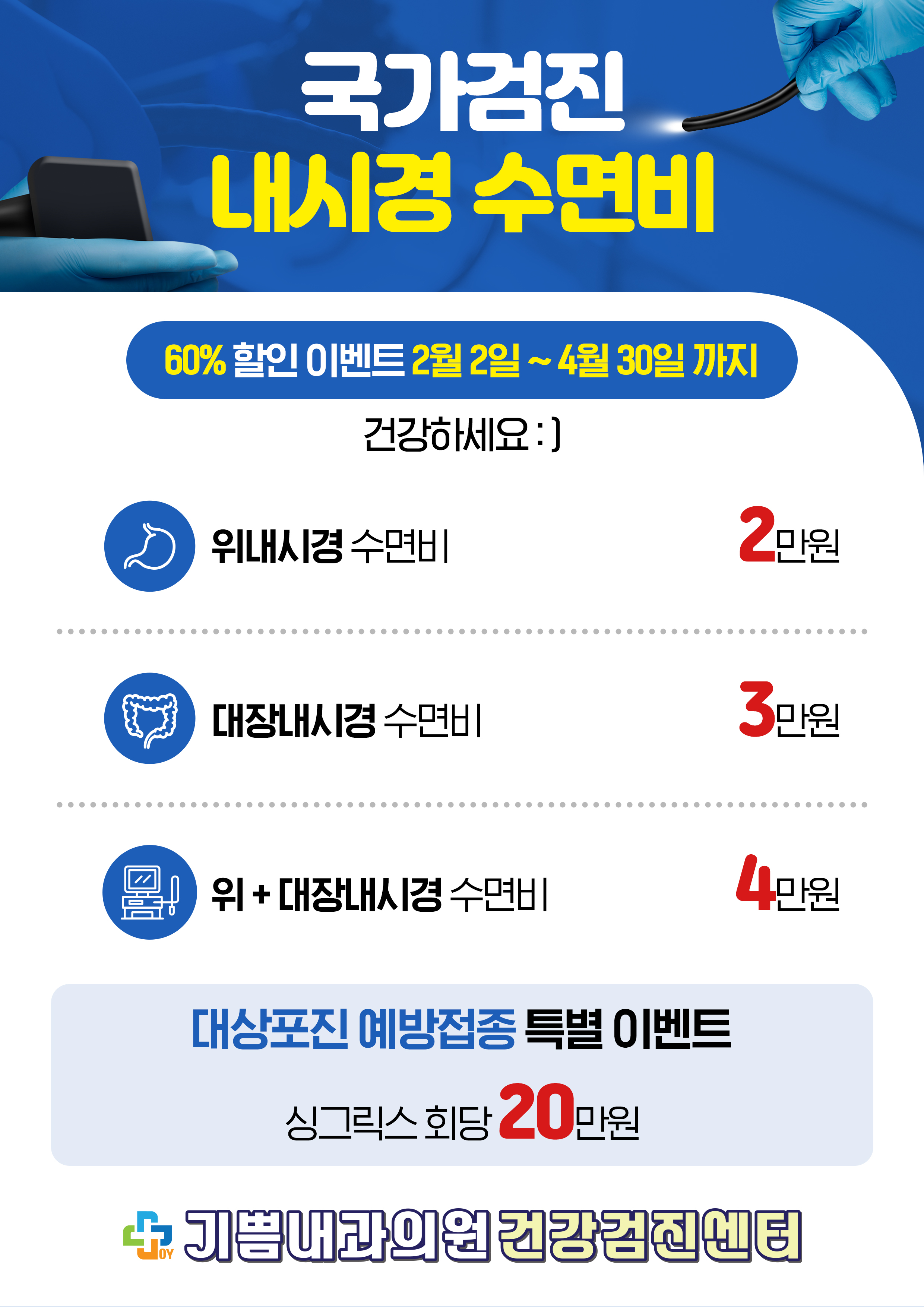 기쁨내과에서는 강동구 주민분들의 질환 조기발견과 치료를 위해 5대암 건강검진을 진행하고 있습니다.